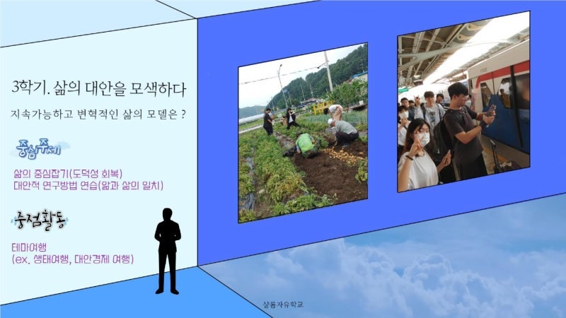 3학기의 교육과정은 지속가능하고 변혁적인 삶을 위하여 자신의 삶의 기준을 세우고 어떤 분야에서 살아가든 앎과 삶을 일치시키는 모습으로 살아갈 수 있도록 준비하는데 목적을 둡니다.